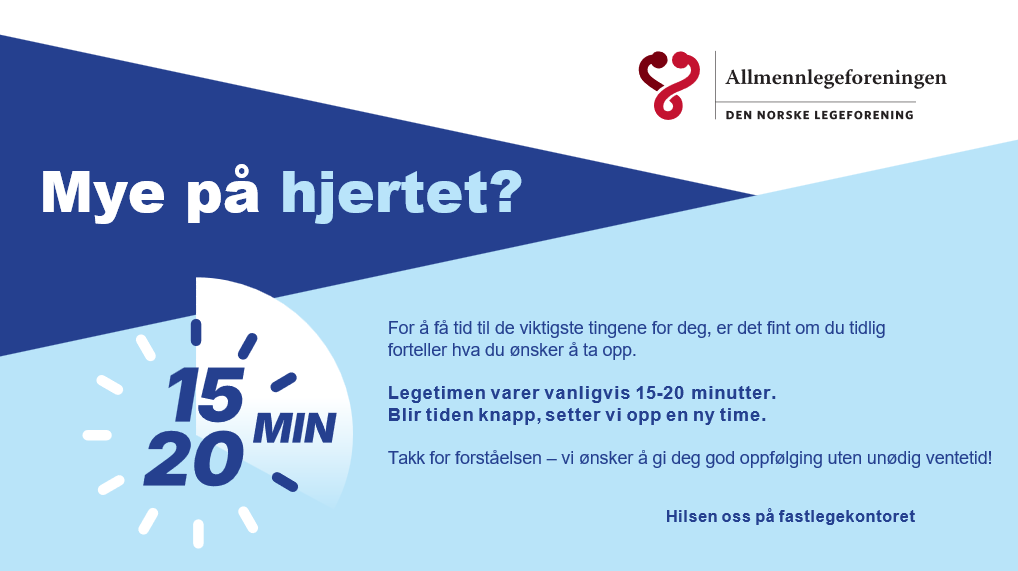 Angående E-konsultasjon: I perioder med ferie/kurs eller dersom for stor arbeidsbelastning på legene vil denne tjenesten være avskrudd. Man kan da IKKE bruke e-kontakt istedenfor. Kontakt oss da pr. tlf eller bestill en vanlig legetime (eller vent til legen er tilbake)